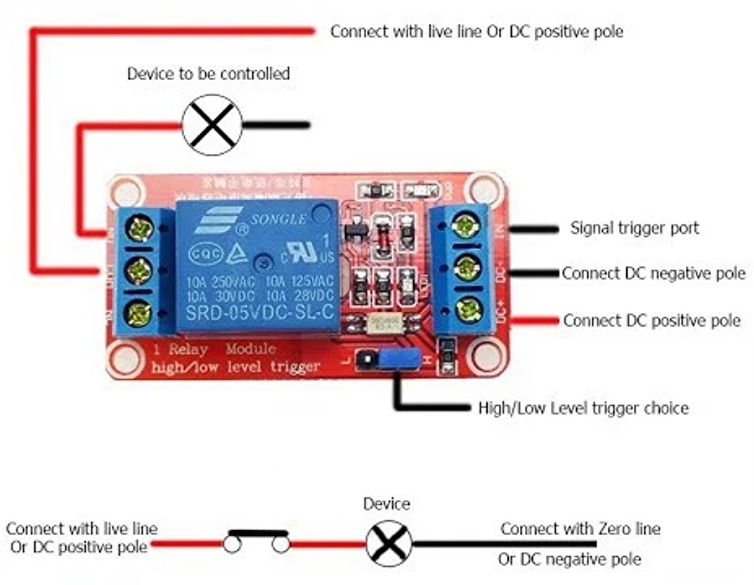 - DC +: Kết nối cực dương của nguồn điện (là điện áp kích hoạt relay, ghi trên nhãn relay 5V ).
