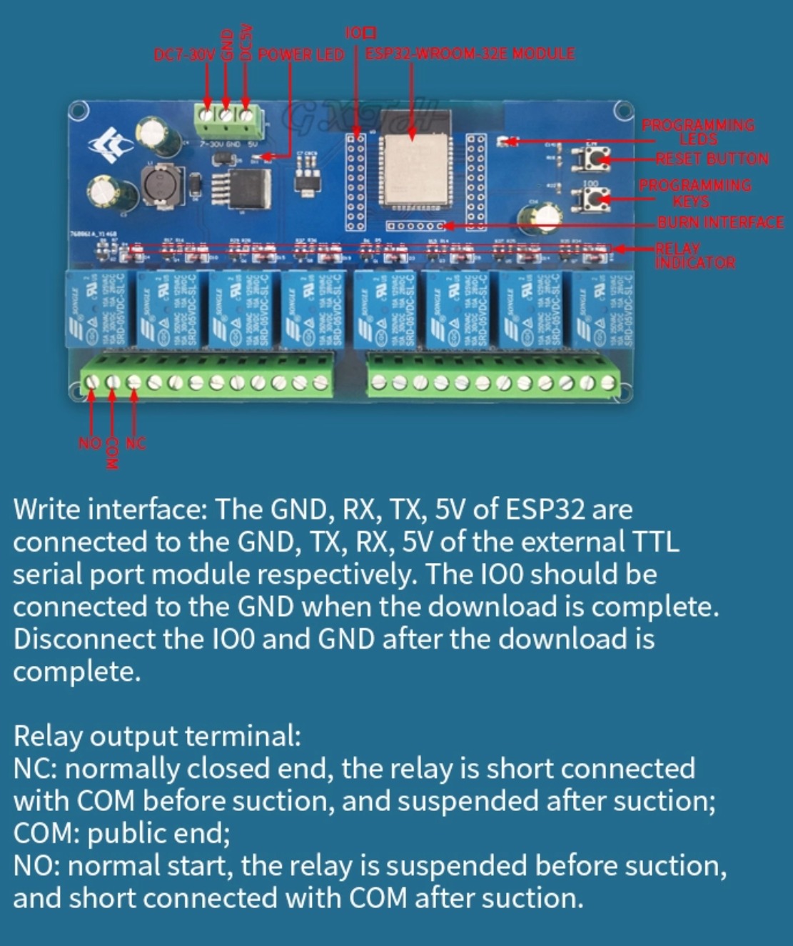 Bảng phát triển rơle tám chiều esp32 được trang bị mô-đun WiFi & BLE esp32-wroom-32e, với tất cả các cổng I / O được dẫn ra ngoài và hỗ trợ chế độ cấp nguồn dc5-30v. Thích hợp cho việc học phát triển thứ cấp esp32, nhà thông minh