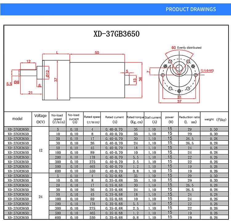 Kích thước động cơ:(L+50)*37MM