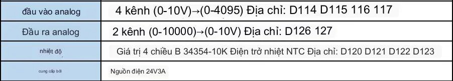 | Đầu vào analog | 0 | 4 | 0 | 4 kênh | 4 kênh |